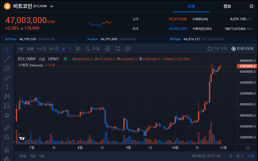 비트코인은 2023년 10월 31일 현재 업비트 기준 47,000,000원에 거래되고 있으며, 바이낸스 기준 34,650$에 거래되고 있으며 시가 총액은 코인마켓캡 기준 913.0조 원이다.