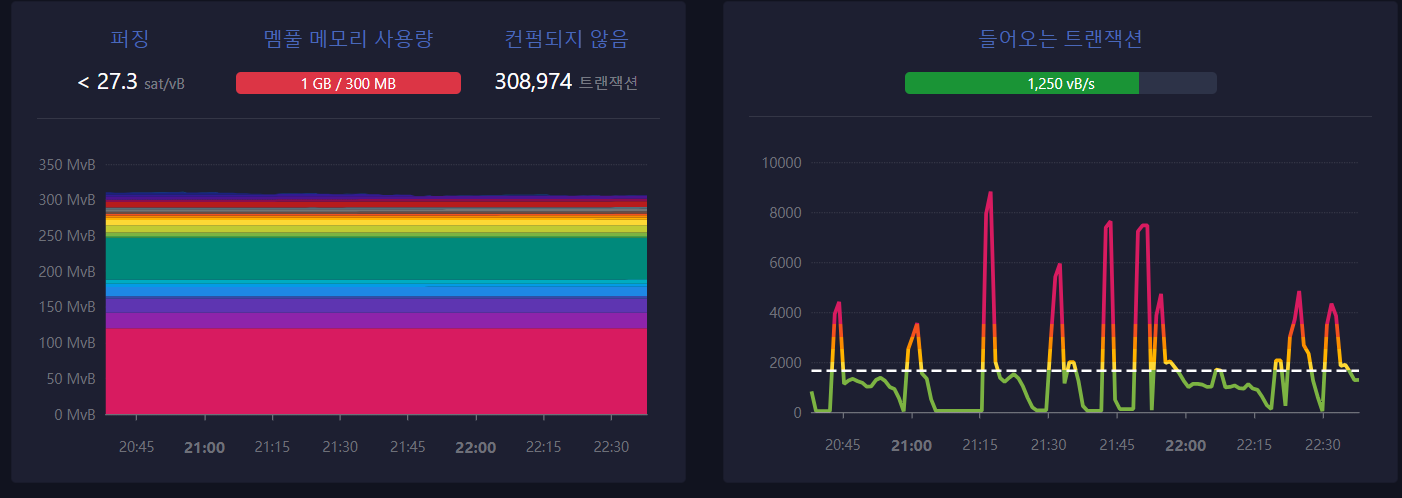 현재 2023년 11월 16일 밈풀에서 가져온 데이터에 따르면 상당히 혼잡한 것을 알 수 있다. 메모리 사용량만 봐도 그렇다. 비트코인 메모리 사용량은 300MB인데, 현재 1기가에 달했고, 현재 거래 대기 중인 트랜젝션(거래)만 30만여개에 달한다고 한다. 지금까지 이정도로 혼잡한 적은 없었으며 언제까지 이런 포화상태를 유지할 지는 아무도 모른다.