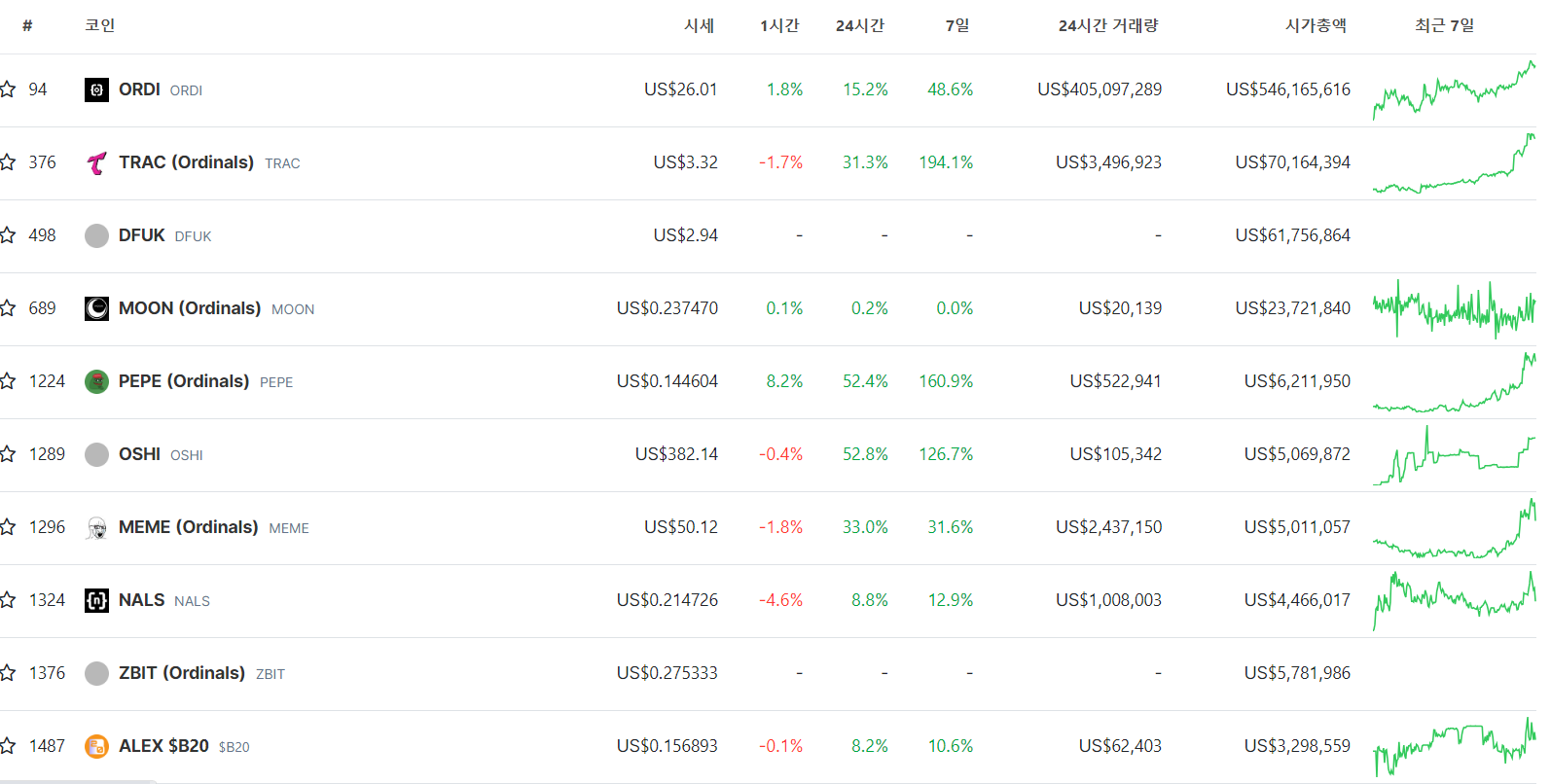 현재 오디널스 프로토콜인 BRC-20을 통해 만들어진 오디널스 관련 코인은 대표적으로 ORDI, TRAC, PEPE(Ordinals), MEME(Ordinals 등이 있다.
