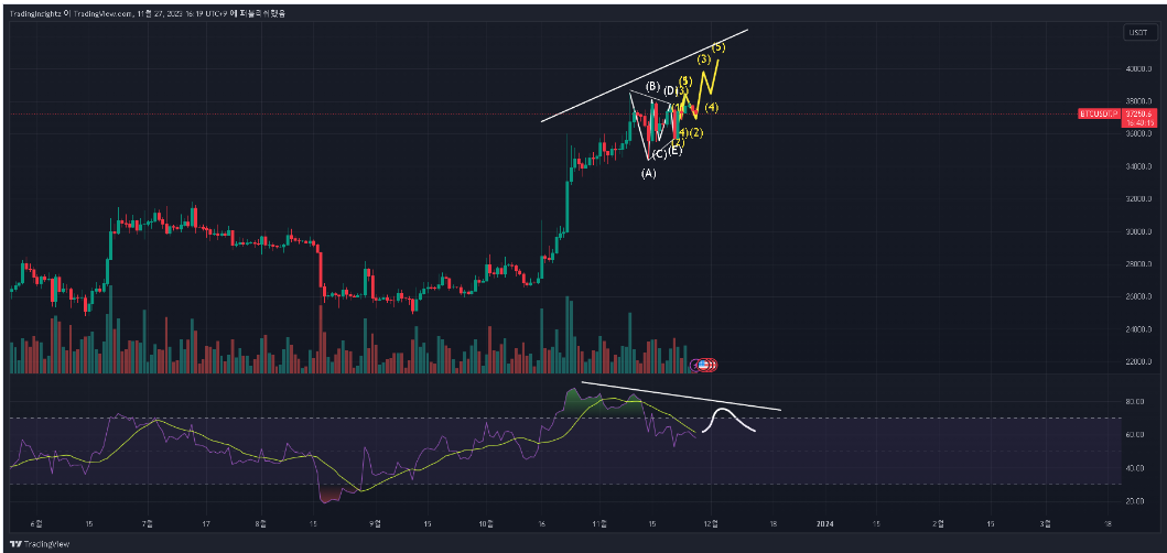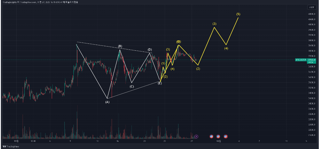 오늘 2023년 11월 29일자 비트코인 차트 분석 시작하겠다. 비트코인 차트 분석과 현재 비트코인의 전망에 대해 알아보는 시간이다. 개인적 의견이니 투자의 근거로 쓰지 말고 참고용으로 쓰길 바란다.