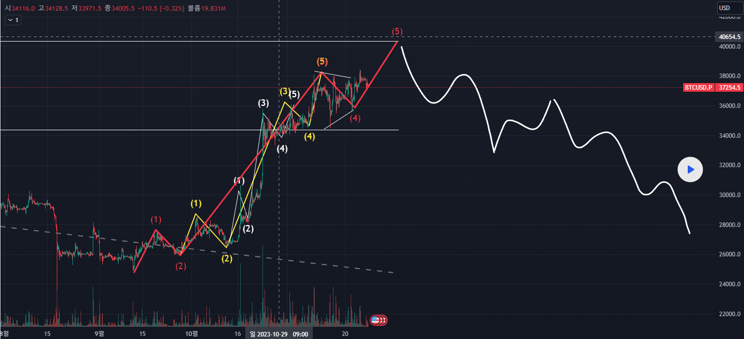 마지막 부분을 살펴보면, 위 이미지처럼 4파가 흰색 삼각수렴 형태로 출현했고, 이후 하나의 5파동이 출현했으나 이를 전체 파동의 5파동이라고 생각하기는 너무 크기가 작습니다. 따라서 이를 마지막 5파동의 1파로 보고 노란색 5파동이 위 이미지처럼 출현하면서 40k 부근까지 도달하면서 전체 파동을 마무리할 것으로 생각하고 있습니다.