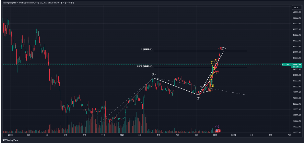 한 규모 큰 시간 프레임에서는 위 이미지와 같은 3개의 파동으로 상승한 것으로 보입니다. 그리고 이 3개 파동의 1:1 비율인 40400달러 부근을 현재 아이디어에서 보고 있는 파동의 끝으로 보고 있습니다. 역시 더 큰 시간 프레임에서는 이 파동이 다들 예상하는 2024-2025 불장의 상승파동의 시작이 될 것인지, 여전히 하락파동이 진행되고 있는 중 반등 파동인지는 지켜봐야겠습니다. 개인적으로는 저점 갱신보다는 불장의 가능성을 높게 보고 있습니다. 그렇다면 현재 카운팅이 맞을 경우 최근까지 지켜보던 불장 전 마지막 하락이 되겠으며, 만약 40k를 강하게 돌파하면서 큰, 거래량이 동반된다면 현재 아이디어의 카운팅이 틀렸고 더 큰 임펄스 파동이 진행되고 있을 수 있겠고, 혹은 ABC가 반복되면서 다이아고날 형태의 파동으로 고점을 갱신하는 시나리오 등 몇가지 가능성이 있겠습니다. 너무 큰 시간 프레임의 차트를 예상하는 것은 어려운 만큼 의미가 있지는 않기 때문에 현재는 이 아이디어의 카운팅처럼 1년 간의 상승 파동에 대한 되돌림 혹은 하락 파동이 출현할 것으로 생각하고 있습니다.