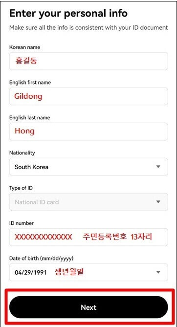 이어서 2단계 본인인증을 시작합니다. 아래 예시를 참고하여 개인 정보와 주소를 입력하신 후 넘어가줍니다.