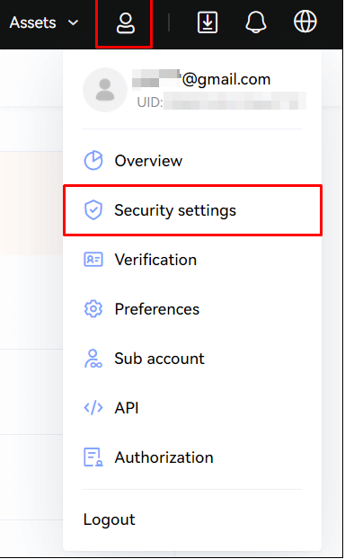 OKX에서 출금하기 위해서는 '구글 OTP 인증'과 '자금 비밀번호 설정'이 필요합니다. 우측 위 메뉴에서 사람 모양 클릭 후 'Security Settings'으로 들어갑니다.