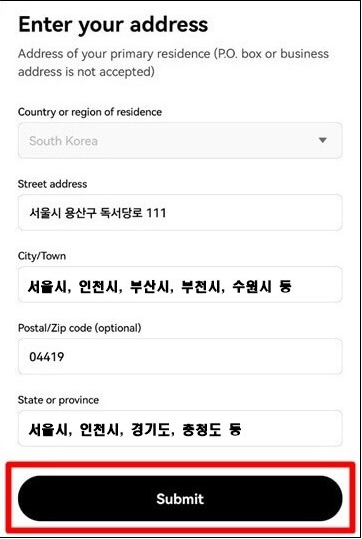 이어서 주소를 입력하면 됩니다. 저는 (Street address) 란에서 동과 호수는 생략하였고 한글로 작성하였습니다.