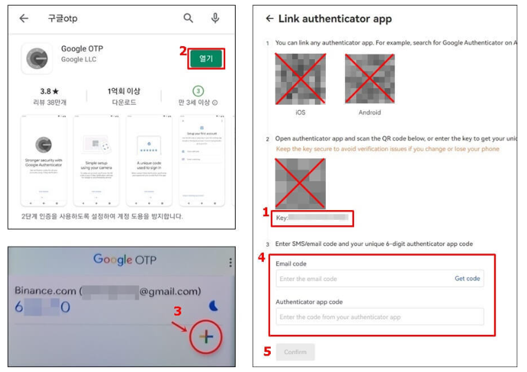 2. 이제 휴대폰을 킨 후 플레이스토어 및 앱스토어에서 '구글 OTP'를 입력 후 설치 및 실행합니다. 그다음 '+모양'을 누르시고 '설정 키 입력'을 눌러주세요