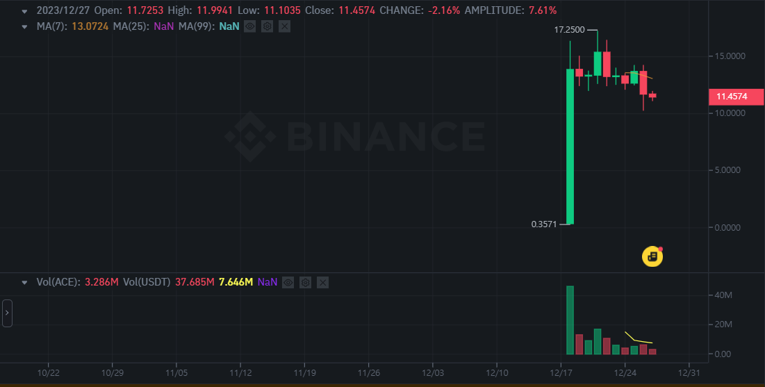 NFP코인은 오늘 바이낸스 런치풀 프로젝트를 끝내고 바이낸스에 첫 상장되어 현재 약 1.2 달러에 거래되고 있다. 여타 다른 런치풀, 런치패드 프로젝트들과 다르지 않은 무빙을 보여주고 있기 때문에 ACE코인 일봉을 살펴보며 전망을 예측해 보겠다.