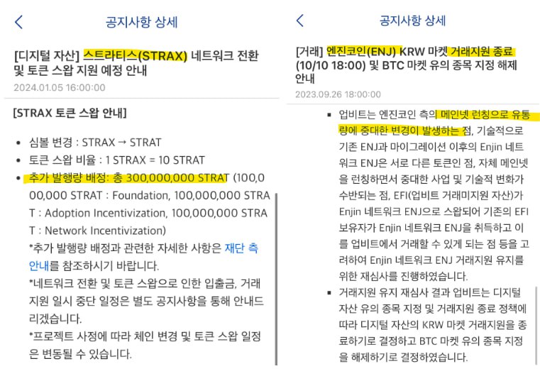작년 9월, 업비트에서는 엔진코인 ENJ를 원화 상장에서 폐지 시켰다. 그 이유는 마이그레이션을 하면서 최대 유통량을 2.5억개 추가 발행하려다가 걸렸기 때문이다. 그 때 업비트에서는 '유통량에 중대한 변경이 발생하는 점' 이라는 이유로 상장폐지를 시켰지만, 현재 스트라티스는 오히려 친절히 공지까지 띄워주면서 홍보중이다.